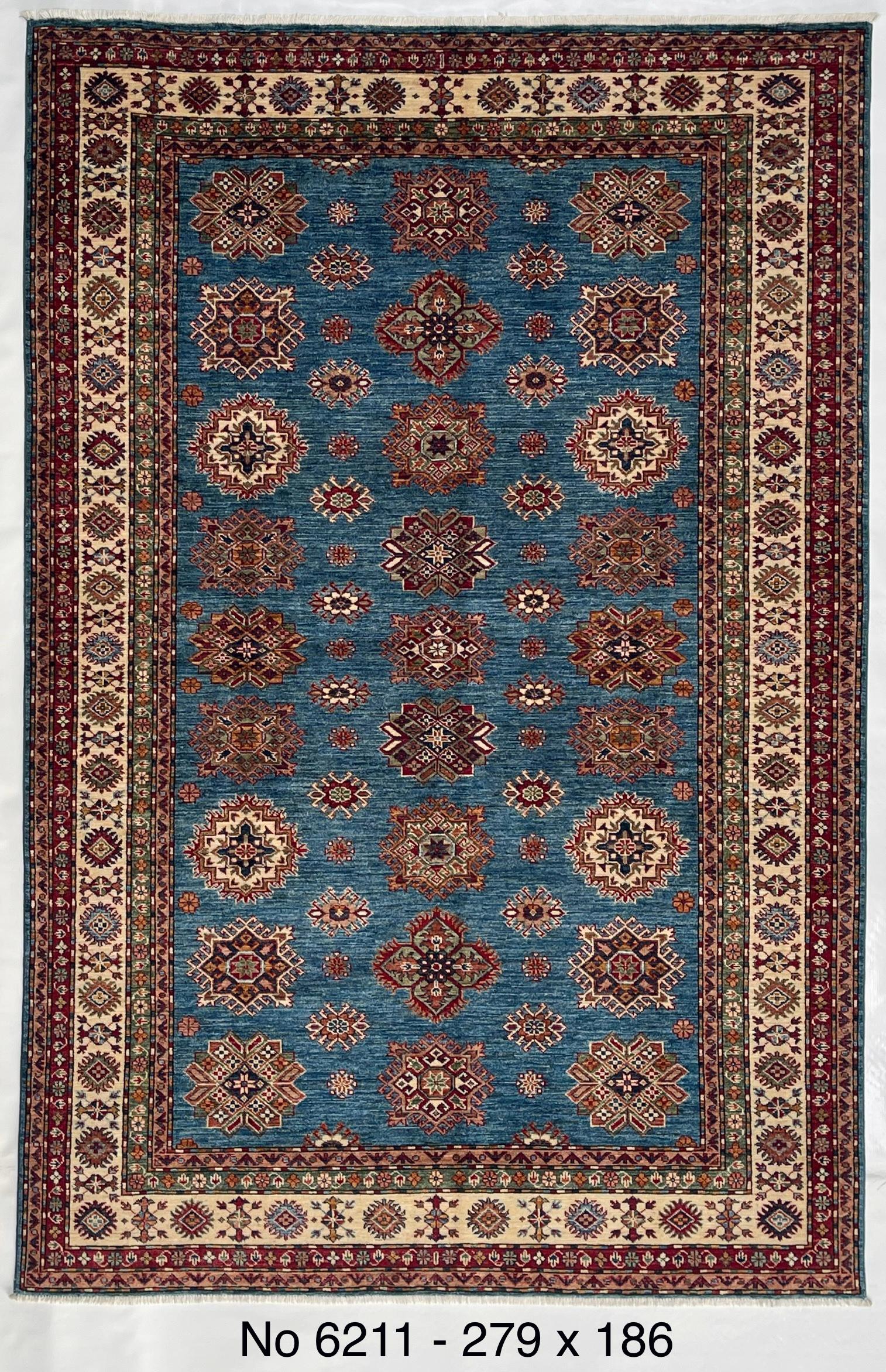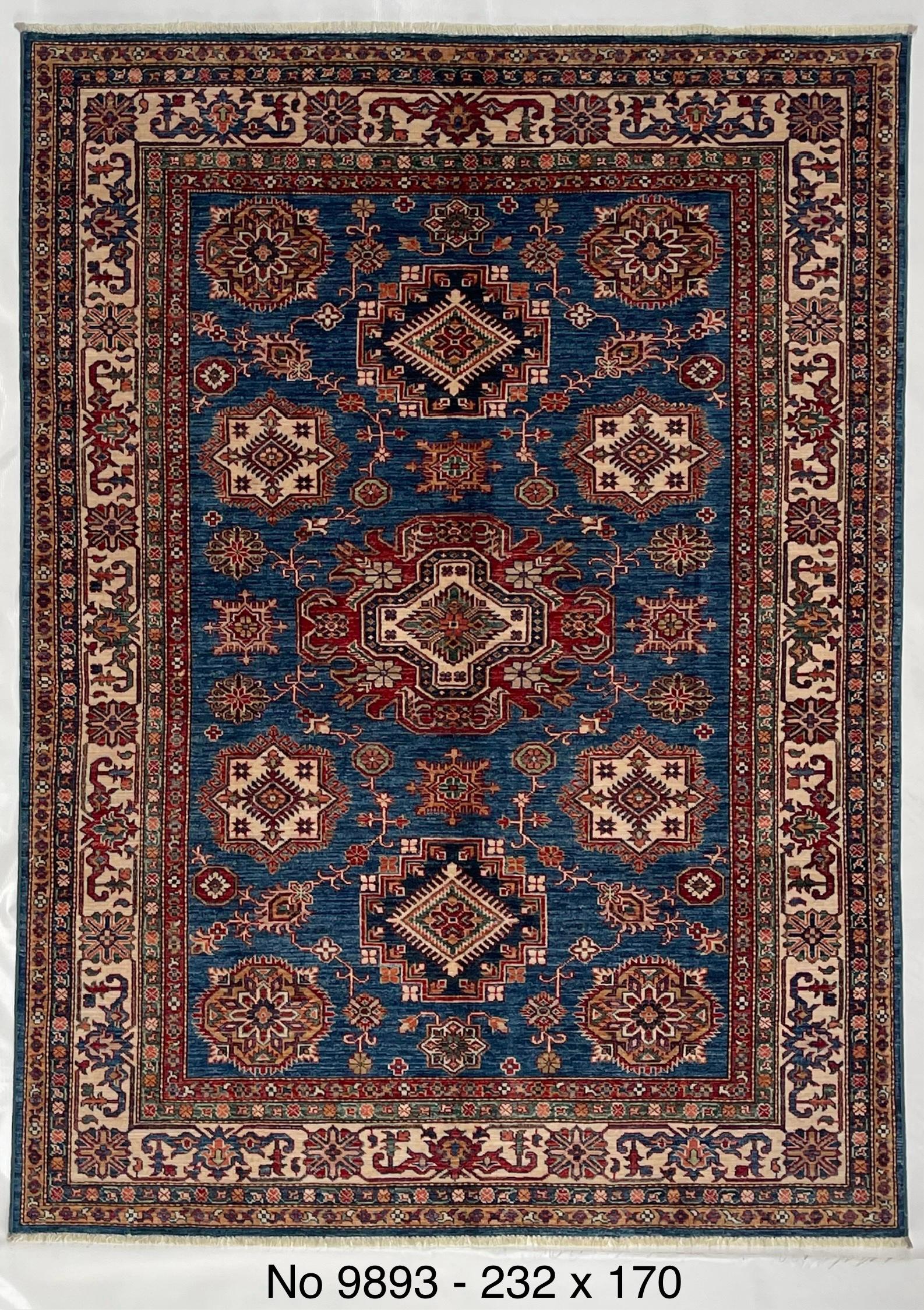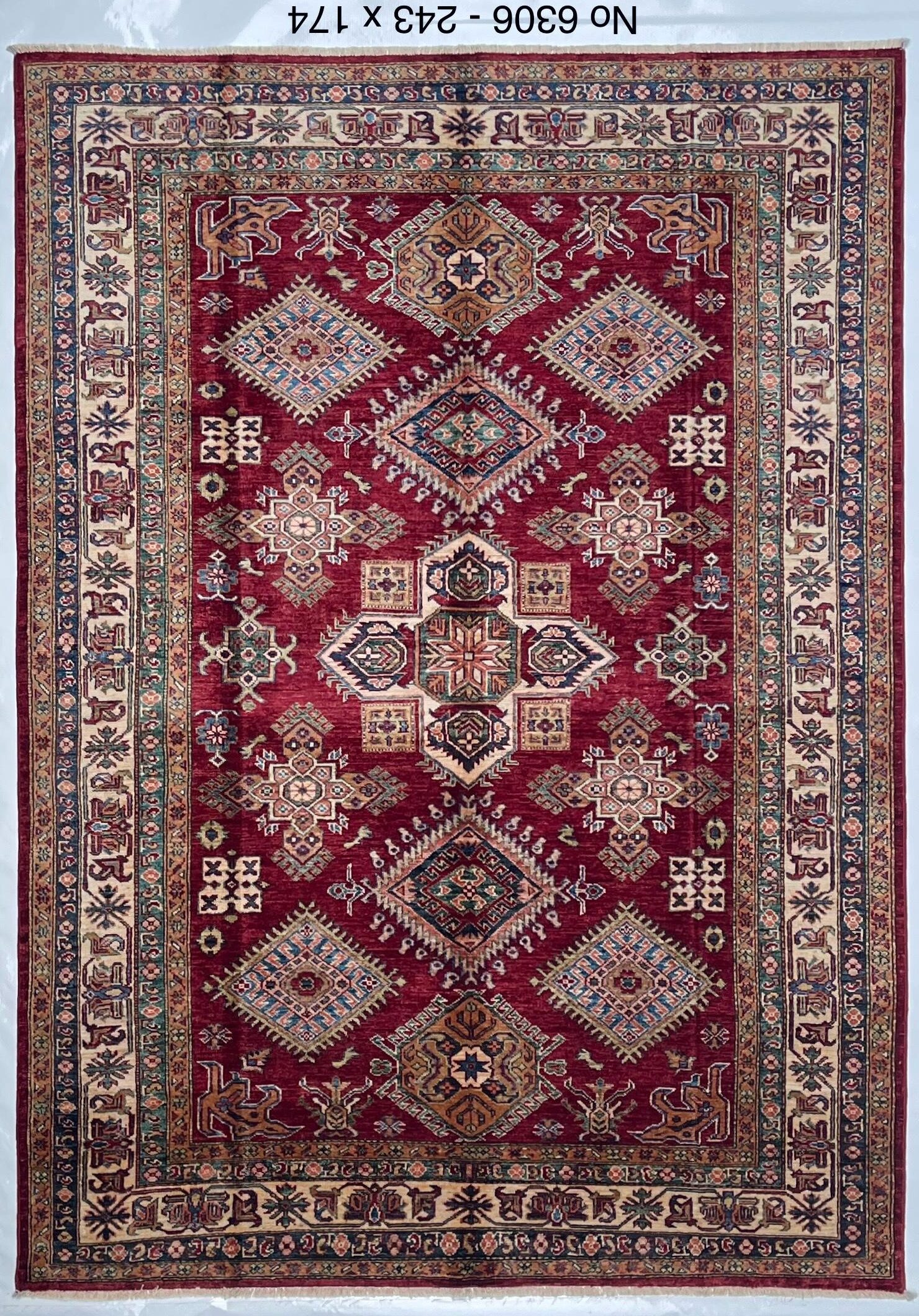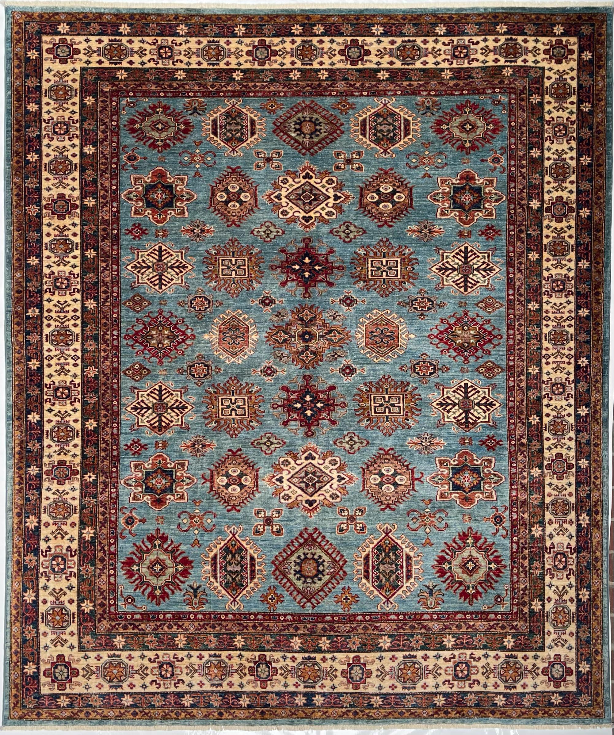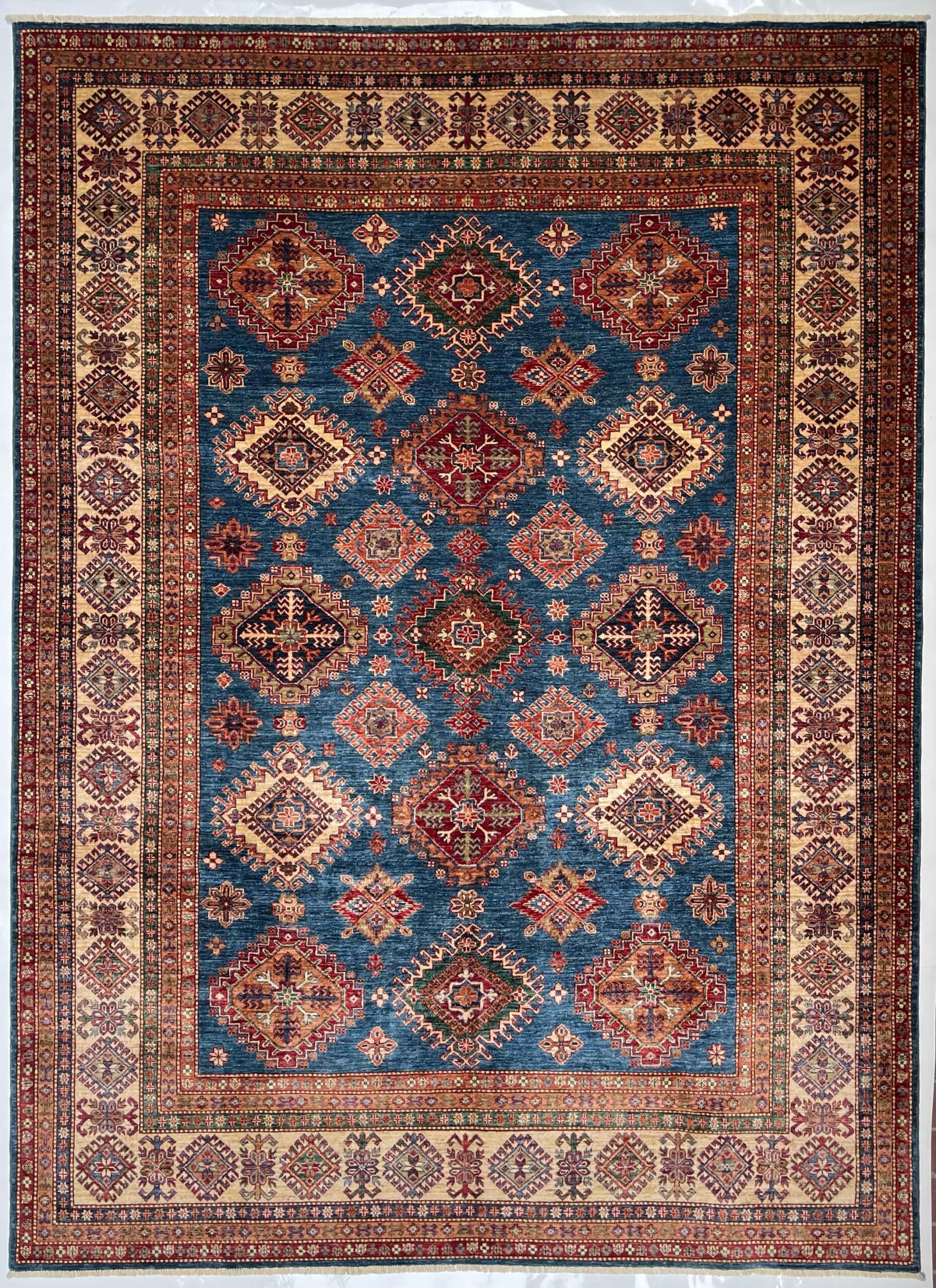 A Kazak rug is a distinctive type of hand-knotted rug originating from the Caucasus region. It is known for its bold, geometric designs, vibrant colors, and durable wool construction. Today, the tradition of Kazak rug weaving continues, particularly in Afghanistan and Pakistan. These modern rugs use high-quality hand-spun, natural dyes, are famous for their large-scale bold geometric motifs, and feature striking colors. Kazak rugs are durable, distinctive, and bring a sense of warmth to interior spaces.