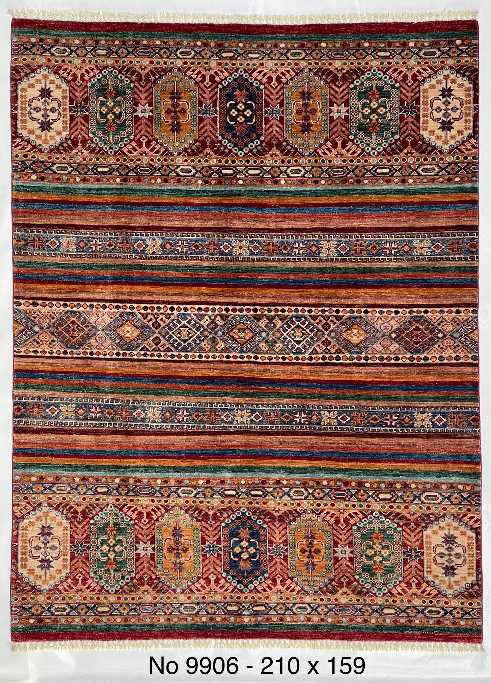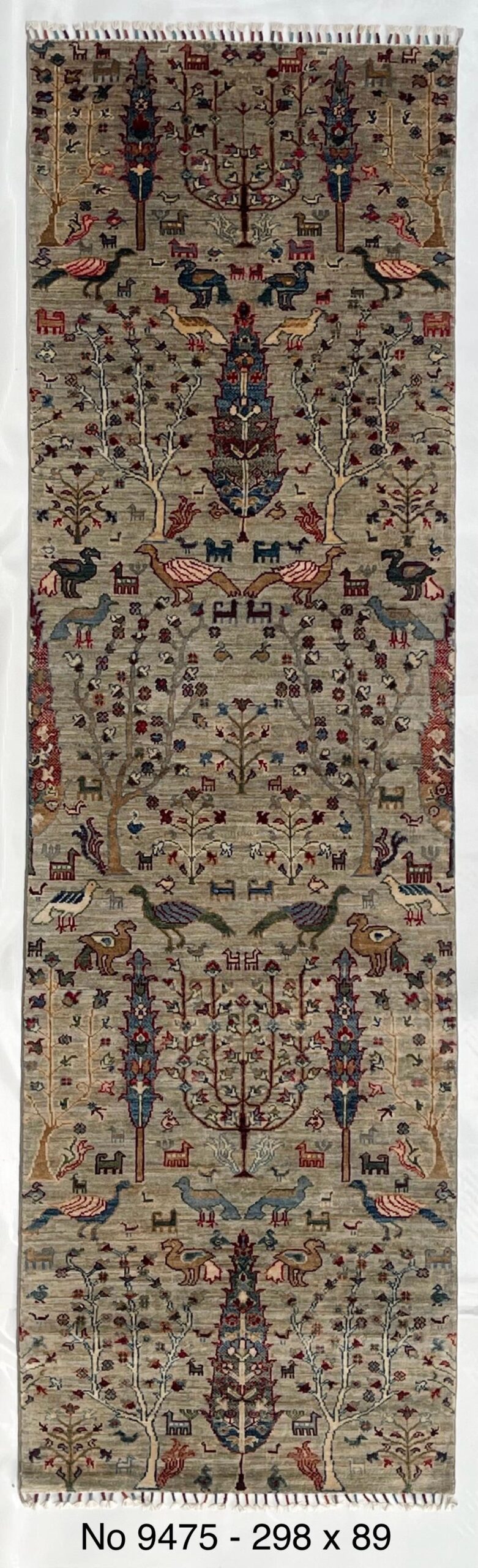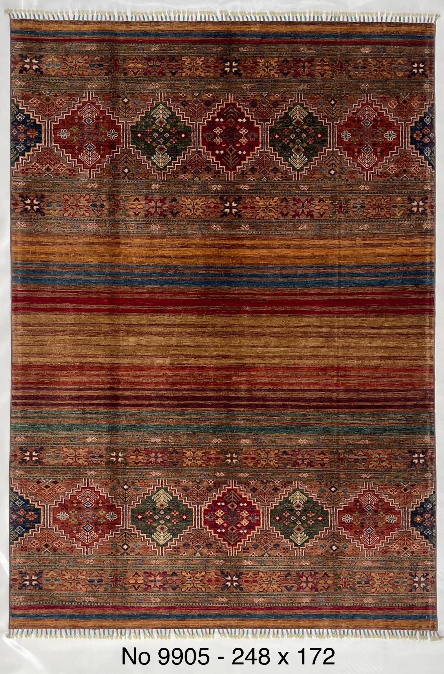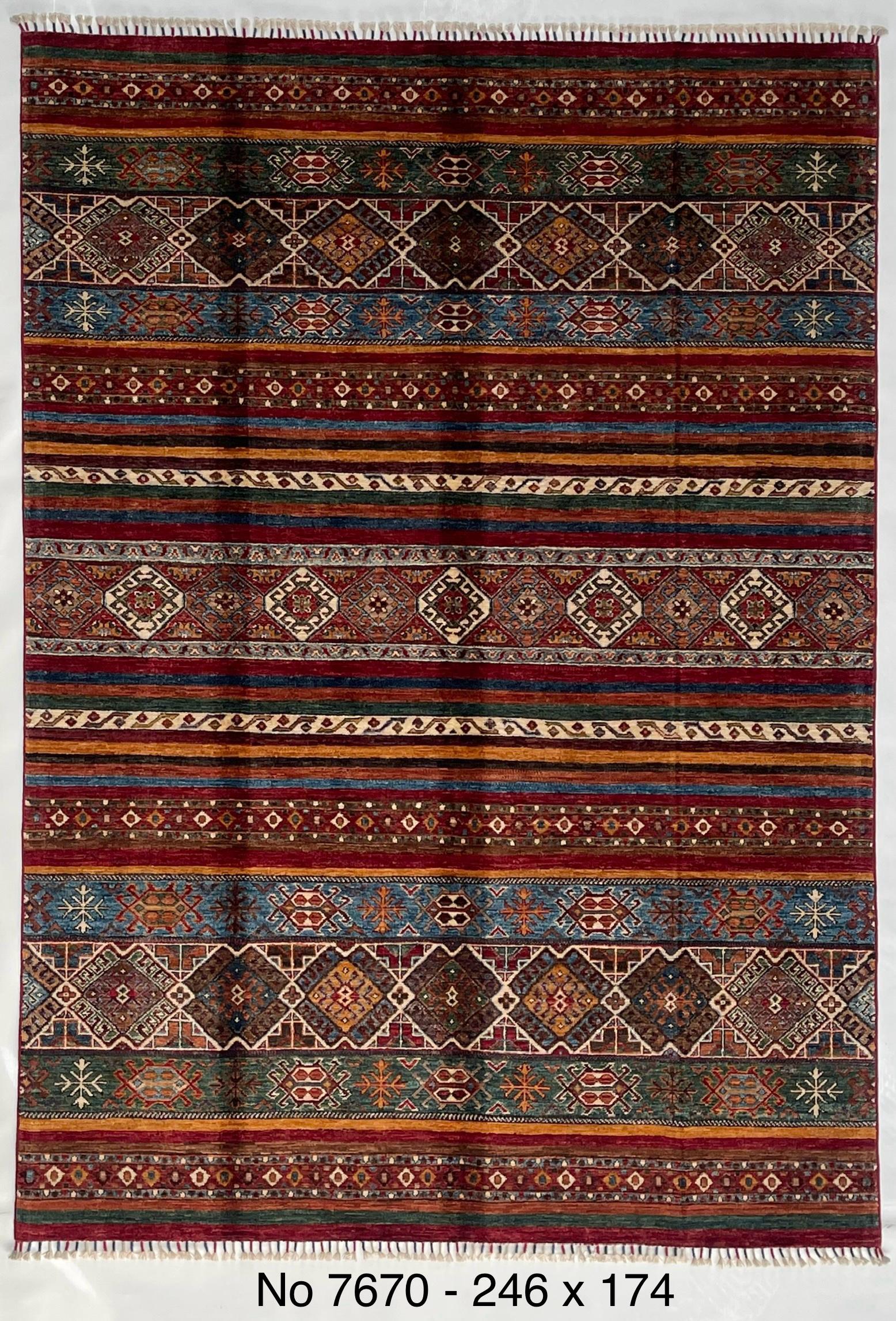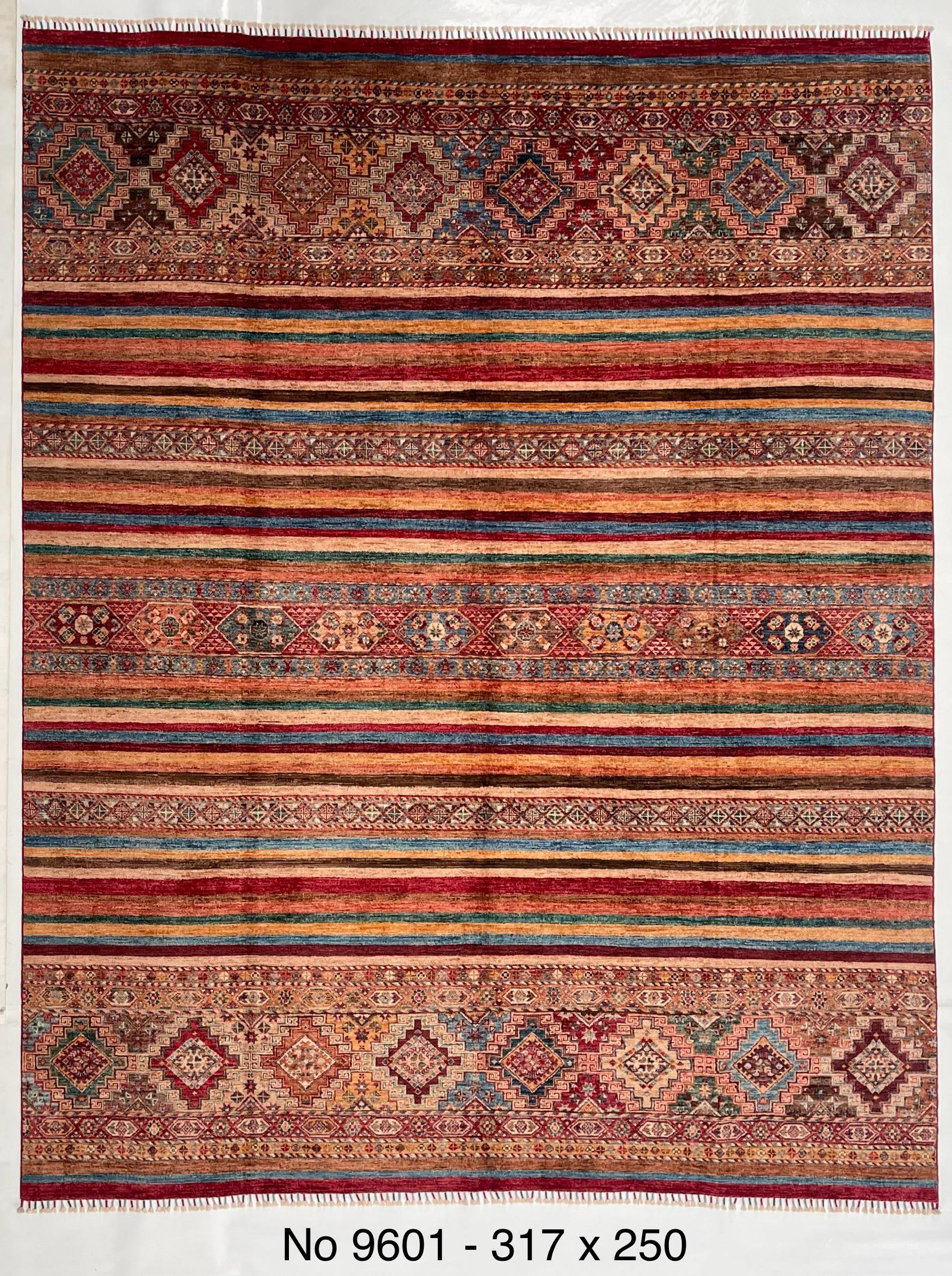 Khorjin rugs are primarily hand-knotted rugs reflecting distinctively tribal and nomadic life. The word ‘Khorjin’ itself comes from Persian and refers to a double saddlebag used by monadic tribes. Khorjin rugs evolved from these practical bags and were eventually woven in the style of the khorjin bag faces. Its design often reflects the two sides of the original saddlebag, though the designs are predominantly geometric, featuring a rich vocabulary of tribal motifs. Typically woven with hand-spun wool, bright and contrasting colors characterize Khorjin rugs and often lack a distinct, elaborate border system. They are valued for their authenticity, the artistry of their geometric designs, and the quality of their handcraftsmanship.
